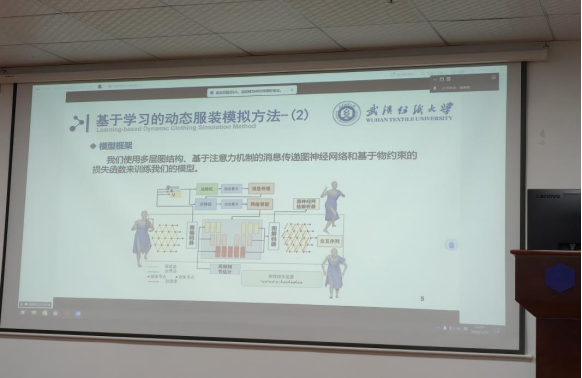 黄展翌同学分享的主题为“DLGGSN: Dynamic Long-range Attention Graph Garment Simulation Network”。在计算机图形学中,为运动中的身体创建高保真度的3D服装褶皱效果是一项关键挑战。所提方法提出了一种新颖的分层图神经网络,网络结合了消息传递注意力机制和分层潜在空间,以融合长距离节点之间的局部和全局变形关系,这会影响节点顶点的变形结果,并进一步决定服装的褶皱或折叠变形。算法法包括三个关键组件:节点注意力模块计算整个服装网格中每个节点的权重,边注意力模块计算服装周围所有边的权重,有助于在服装上生成逼真的褶皱或折叠。分层潜在空间中的局部细节估计模块用于捕捉局部变形和全局变形与运动身体序列之间的关系。此外,模型中引入了尽可能刚性损失来约束运动序列中的变形。引入STVK模型对弯曲损失和拉伸损失进行了修改。实验结果表明。与现有方法相比,网络能产生更准确且视觉效果更佳的结果。