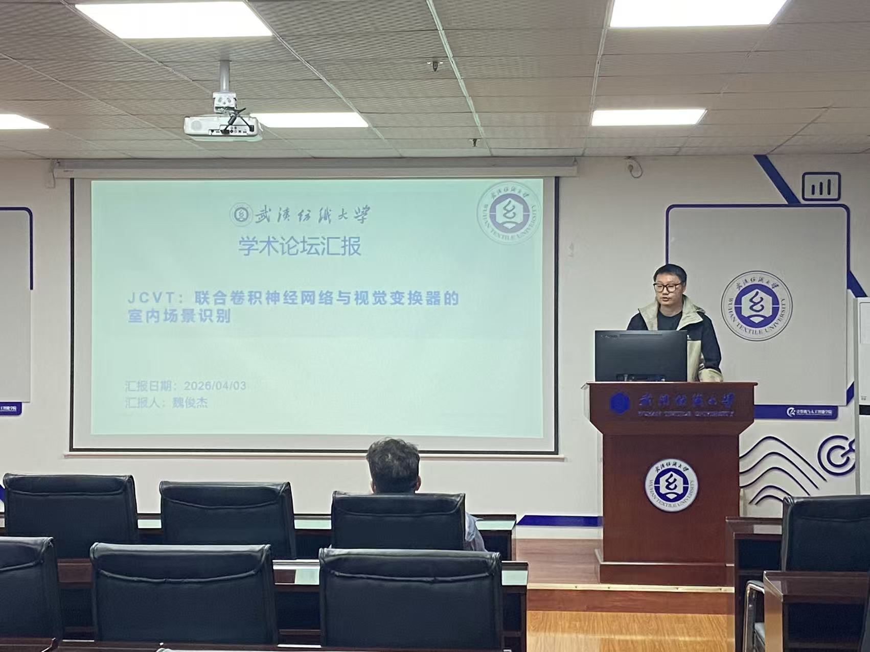 魏俊杰同学分享的主题为“Joint CNN and Vision Transformer for Indoor Scene Recognition”。室内场景识别在智能家居、机器人导航等领域潜力显著,但精度提升仍面临瓶颈。卷积神经网络(CNN)擅于提取局部特征却难以建模长距离依赖,视觉变换器(ViT)则擅长捕捉长距离依赖,两者具有互补优势。为此,提出一种CNN与ViT融合的室内场景识别方法:设计局部增强视觉变换器模块增强Agent-CsWin Transformer的局部建模能力;构建语义增强卷积神经网络模块,以删除分类层的ResNet50为编码器、卷积层为解码器挖掘语义信息;将上述模块与原始ResNet50融合,生成综合特征表示。在MIT67、SUN116和Place120数据集上,识别准确率分别达87.84%、81.22%和63.77%。对比与消融实验验证了方法的有效性与各模块的必要性。