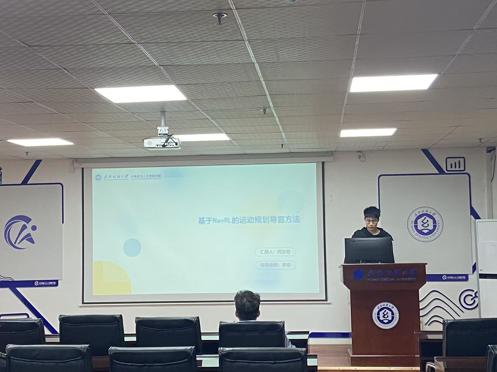 何志奇同学分享的主题为“A motion planning guide method based on NavRL”。本文提出一种基于NavRL的端到端导盲运动规划方法。算法核心采用近端策略优化(PPO),通过改进多模态特征提取网络,高效融合静态地图、动态障碍物及机器人本体状态,形成完整策略输入。引入对数参数化与不对称初始化的Beta策略,增强连续动作空间中强化学习的稳定性与收敛速度。设计综合速度、安全距离与控制平滑性的复合奖励函数,并在PPO-Clip方法中解耦重要性采样率的上下裁剪范围,拓展低概率探索空间。实验结果表明,该方法在目标到达率、累积回报等指标上优于基线算法,并通过多平台仿真验证了其在四足机器人导盲任务中的可行性与有效性。