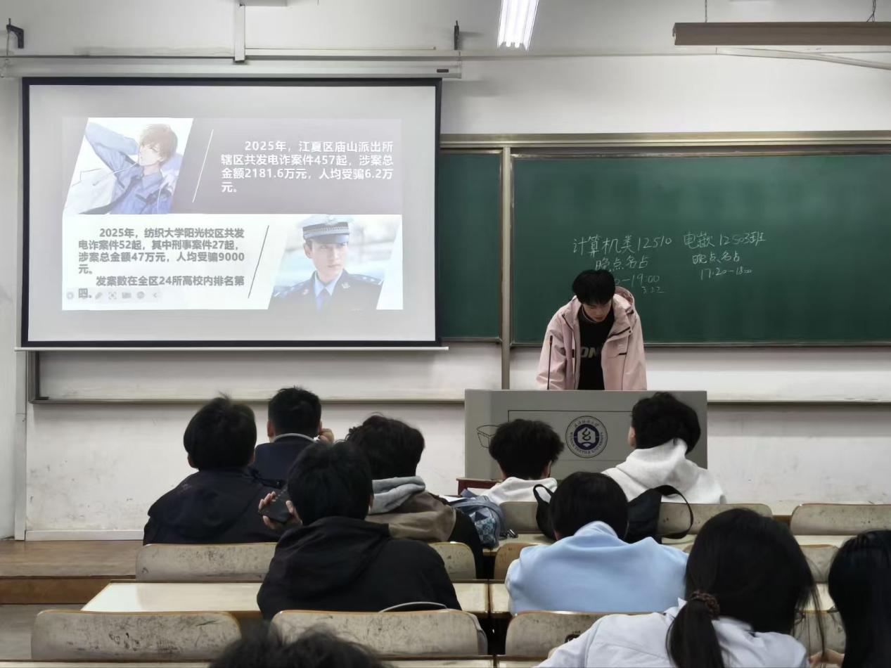 班会最后,各班班长围绕“警惕诈骗新手法,不做电诈工具人”开展安全教育。结合当前校园电信诈骗的高发态势,班长通过剖析典型案例,提醒同学们从源头上守护好个人的“钱袋子”,进一步筑牢校园安全防护墙。
