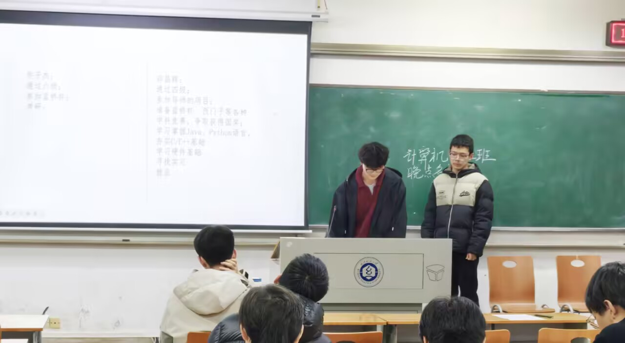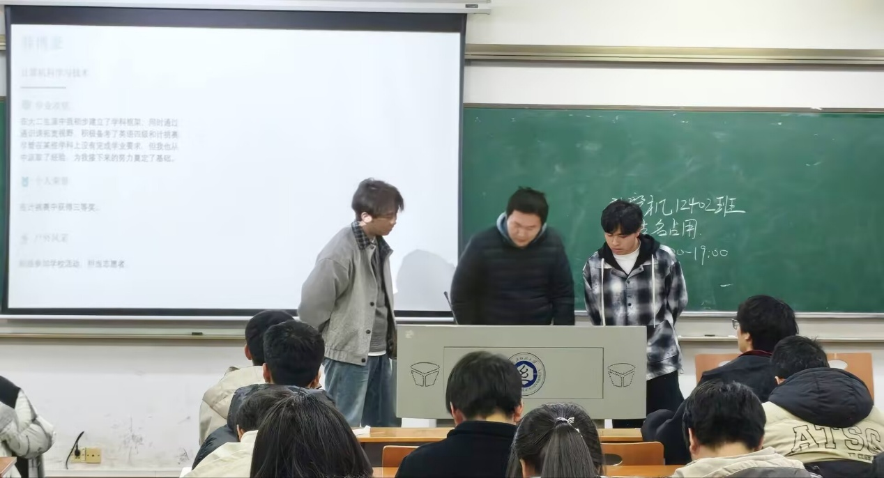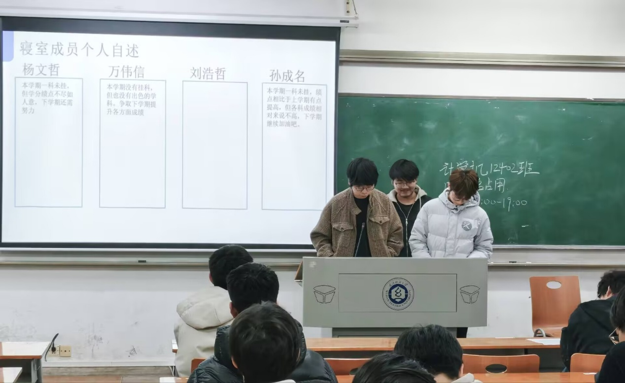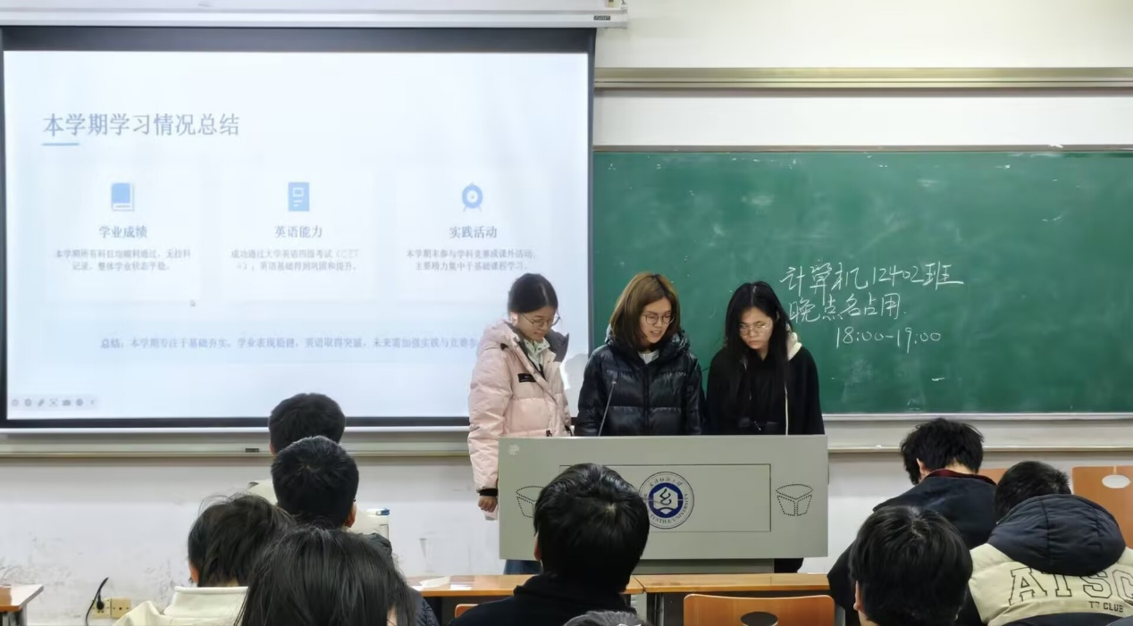 大二上半学年落下帷幕,计算机12402班迎来新发展阶段。为进一步增强集体凝聚力,推动学业提升,更早明确备考方向方向,规划毕业蓝图,近日,我班在崇志楼举行2025-2026学年春季学期小结班会。本次班会由班长卻昌辉主持,辅导员李港全程指导,采用"宿舍汇报制",全班10个宿舍依次登台分享,分享成长的点滴与未来的愿景。