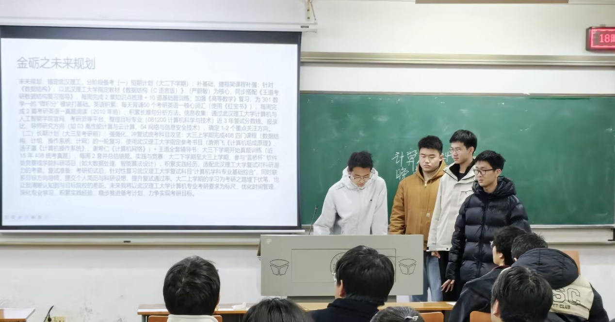 4B515宿舍学业进步显著,但有同学的英语还需加强,虽取得了一定的进步,但仍存在不足,与预料的学习目标还有一定差距。凌思睿同学以500多分的成绩顺利通过四六级,为宿舍树立榜样。这学期他们希望时间安排更合理,专业知识运用更灵活,学业学习深度增强积极参与竞赛。希望积累项目经历与实践成果,贴合武汉理工大学复试中对科研素养、动手能力与创新潜力的考查要求,也有同学想未就业。