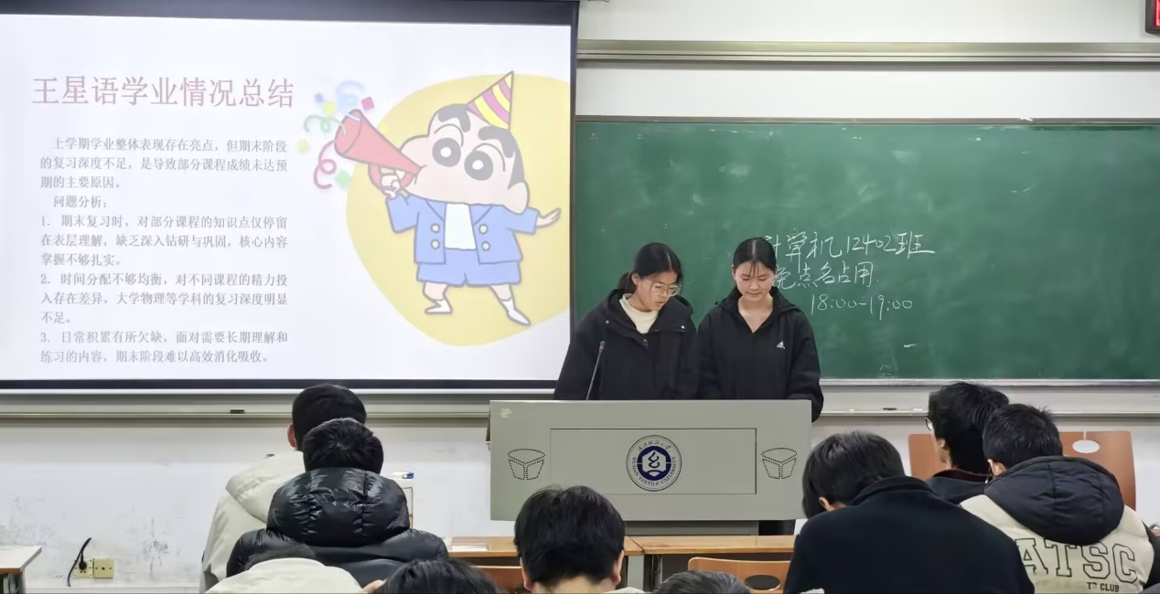会议伊始,班长卻昌辉率先对班级整体学业情况进行全面复盘。他以平均绩点、挂科率、优秀学子表彰等关键数据为脉络,细致剖析班级学业现状,既明晰了优势学科的亮眼表现,也精准梳理出薄弱环节。通过直观的数据分析,帮助同学们找准提升方向,确保新学期发力有据、追赶有标。