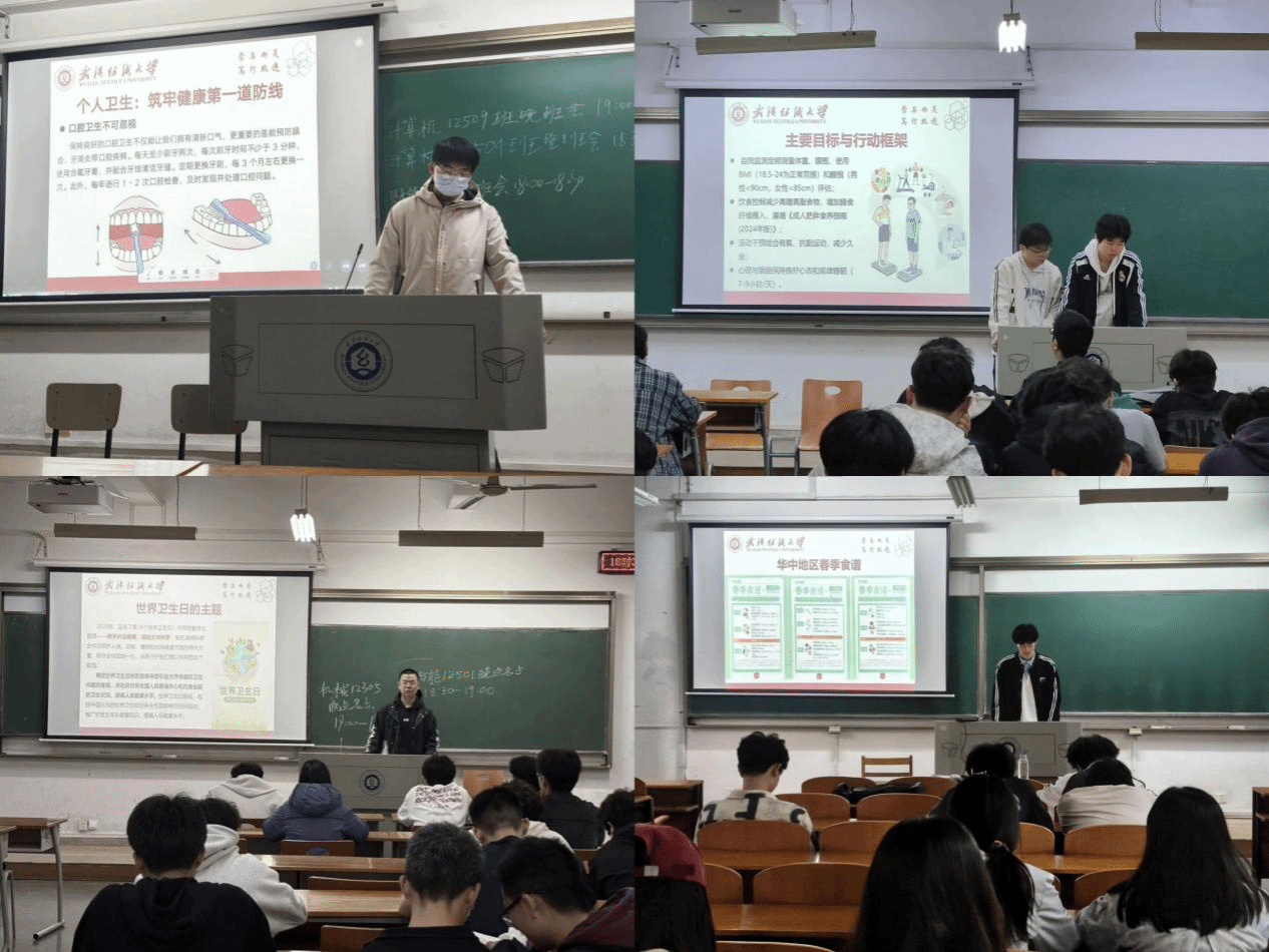 随后,各班围绕第78个世界卫生日“携手共促健康,坚定支持科学”的主题展开学习。同学们从世界卫生日的由来与宗旨出发,系统学习了个人卫生、合理饮食、适量运动、心理健康及环境卫生等健康知识,掌握了“七步洗手法”、“三减三健”(减油、减盐、减糖,健康口腔、健康体重、健康骨骼)等实用技能。在心理健康环节,同学们认识到要积极面对情绪、勇于寻求帮助。此外,各班还重点介绍了国家“体重管理年”三年行动,结合国家卫健委发布的《成人肥胖食养指南》,展示了华中地区的四季食谱,强调科学减脂、健康体重,并温馨提醒:“胖瘦都很美丽,减脂是为了健康。”
