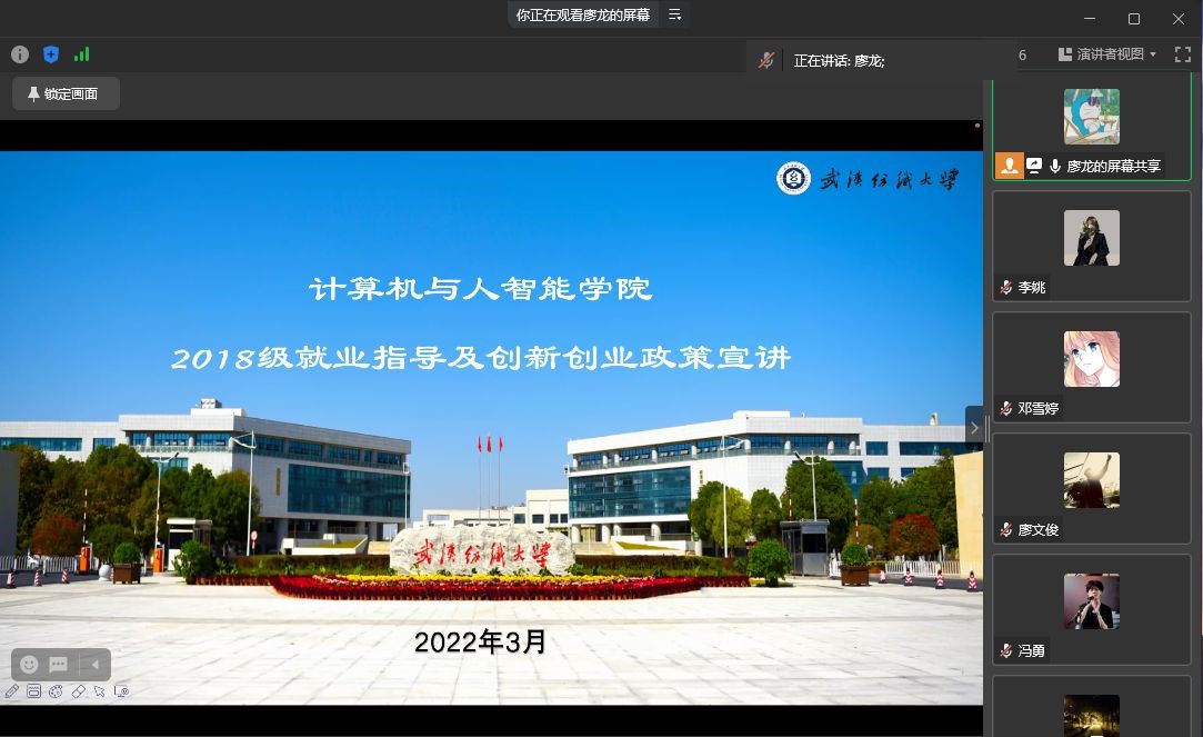 毕业班辅导员廖龙还总结和说明了目前18级学生的就业情况,就同学们最关心的各项三方签约等问题进行了解答,客观分析了学生目前的就业形势,强调毕业生应树立正确的择业观和就业观,学会科学的、合理的、灵活的规划自己的职业生涯,待就业的毕业生应确立符合实际的就业期望值,更新就业观念,正确择业。廖老师建议大家树立“先就业再择业”的择业观,先摆脱眼前的困境,在工作中锻炼自己,积累经验后,再选择更合适的工作岗位,同时鼓励学生到基层、中西部地区、中小企业就业和自主创业。