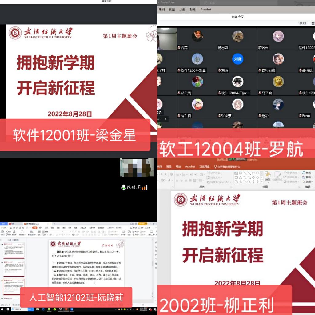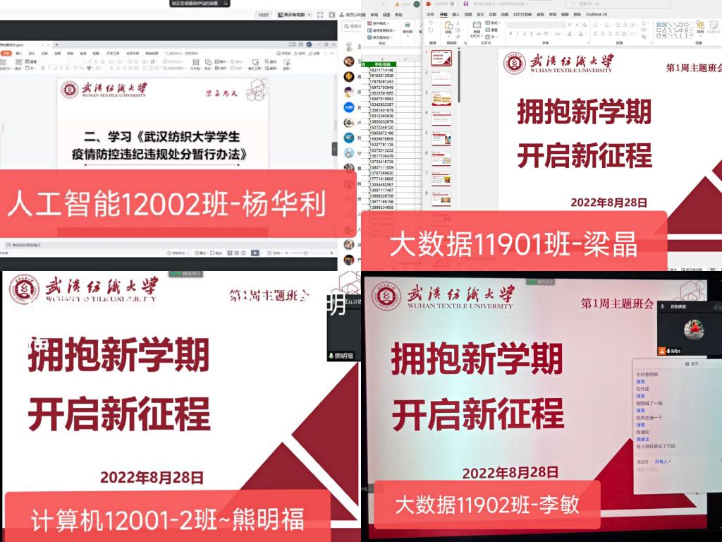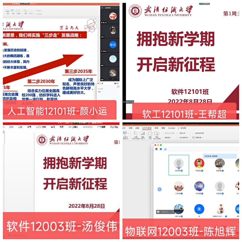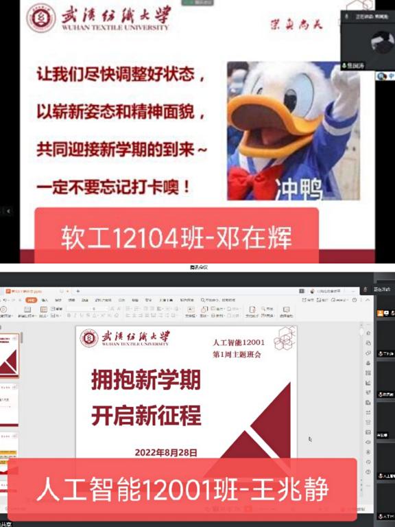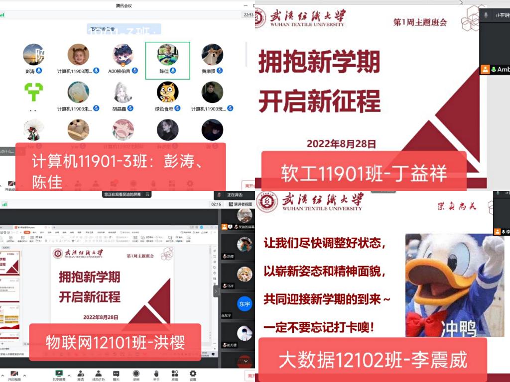 班会上,各班班主任带领同学们学习了湖北省第12次党代会精神,全面了解湖北近五年经济发展取得的七大成就,并学习了实现美好纺大新愿景的“三步走”战略和“一二三四五六七”发展思路。随后就《武汉纺织大学学生疫情防控违纪违规处分暂行办法》、开学期间学校防疫管理要求进行了重点学习,及对校园疫情防控违规违纪行为案例及情况进行了通报,再次增强了同学的疫情防控意识。最后从调整作息时间、提前了解并预习功课、调整心理状态、制定计划目标等方面给予了同学们做好开学准备的建议,号召大家尽快调整好状态,以崭新姿态和精神面貌,共同迎接新学期的到来。以下是部分班级线上班会剪影。