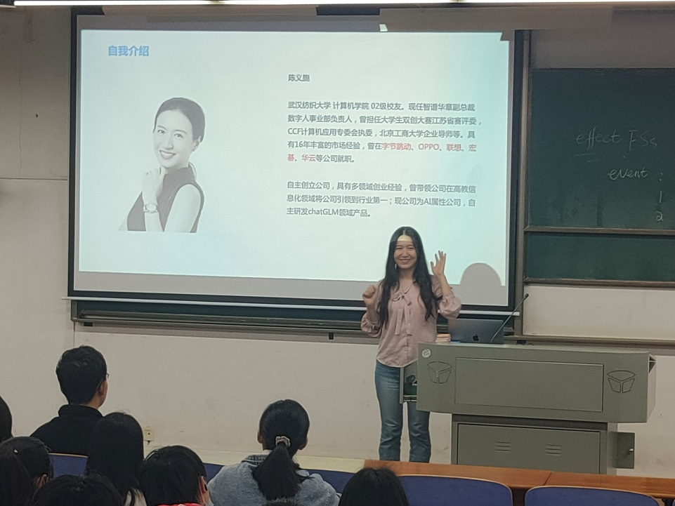 陈义旎从一名公司高管的角度对当前本科生的就业形式进行了详细分析,并结合自身经历讲述了国内外人工智能的发展前景,通过展示聊天机器、面试模拟器等实例,让同学们对人工智能这一领域的发展方向有更加深入的了解。