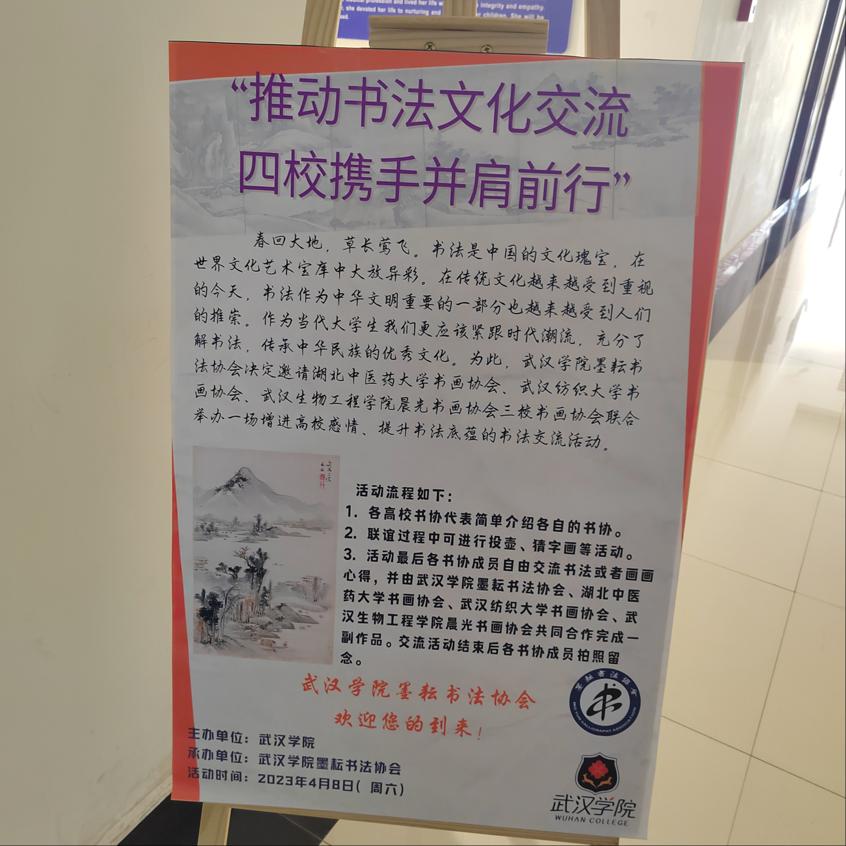四月的阳光,使每一株草都如翡翠繁生,在土地上写着明日之诗,诗章湛蓝一如海洋。4月8日武汉纺织大学书画协会应武汉学院墨耘书法协会之邀,至武汉学院参加由武汉学院墨耘书法协会主办,湖北中医药大学书画协会、武汉纺织大学书画协会、武汉生物工程学院晨光书画协会联办的一场增进高校感情、提升书法底蕴的书法交流活动。