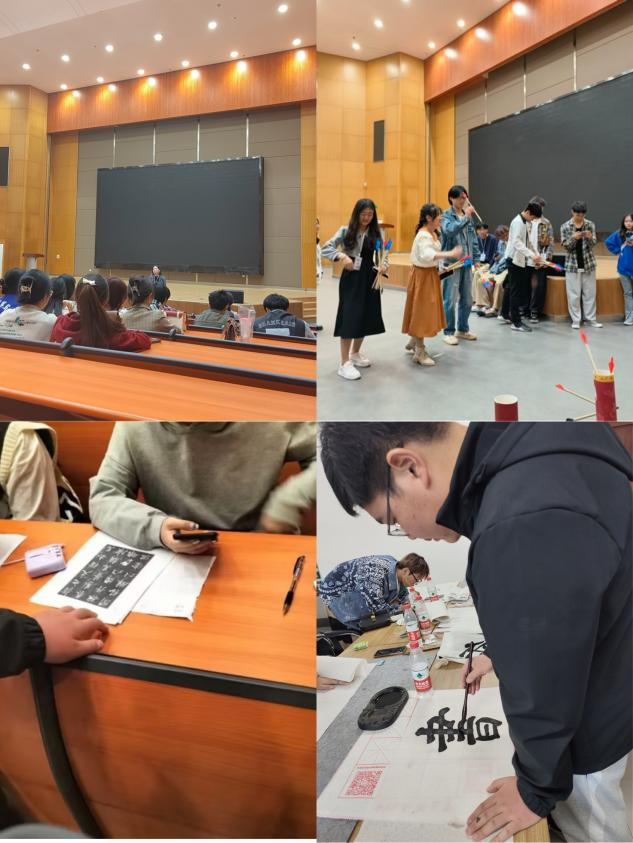 交流会活动中,各高校书协代表介绍了各自书画社团的日常活动及其训练,彼此增进了解。之后大家进行了投壶、猜字画等小游戏,迅速活跃了现场气氛。最后跟随武汉学院的引导来到教室,各书协成员自由交流书画心得,并由武汉学院墨耘书法协会、湖北中医药大学书画协会、武汉纺织大学书画协会、武汉生物工程学院晨光书画协会合作完成一副作品。