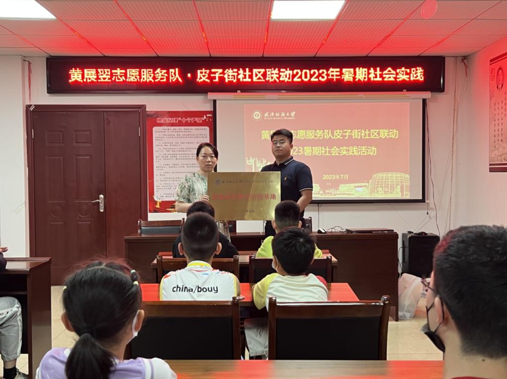 活动伊始,皮子街社区副主任程云莉对志愿者一行表示了热烈的欢迎,她指出大学生进社区开展社会实践加强了高校和社区的联系,是大学生迈向社会、感知社会的重要之举。同时也为社区的小学生带来了生动的课程和多彩的活动,为社区的发展添砖加瓦。学院团委书记廖龙表态志愿服务队将以更饱满的热情、更积极的态度、更优秀的行动做好志愿服务,在社会实践中练就有理想、有本领、吃得苦、肯做事、敢担当的品质。并举行了“武汉纺织大学开云kaiyun体育官方网站·思想政治教育实践基地”挂牌仪式,希望日后学院能够与皮子街社区继续合作,持续开展系列主题志愿活动,同时通过志愿实践活动加强对学院学生的思想政治教育。