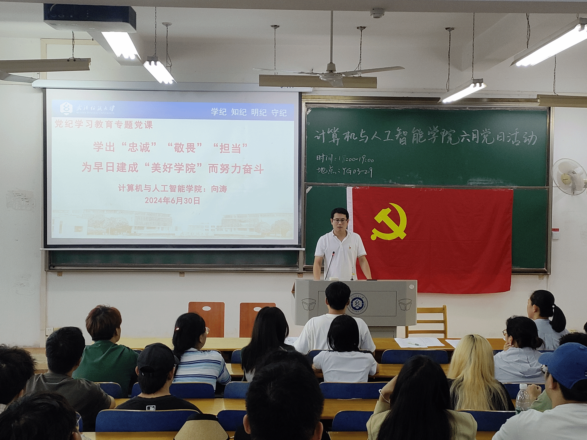 为深入学习贯彻习近平总书记关于党纪学习教育的重要讲话和重要指示精神,引导学生党员学纪、知纪、明纪、守纪,6月30日下午,武汉纺织大学开云kaiyun体育官方网站学生党支部于3号教学楼219教室开展党纪学习教育专题党课活动。会议由本科生第一党支部书记张栋主持,学院党委副书记向涛,辅导员廖龙、喻仪、余梦帆,全体学生党员共同参加。