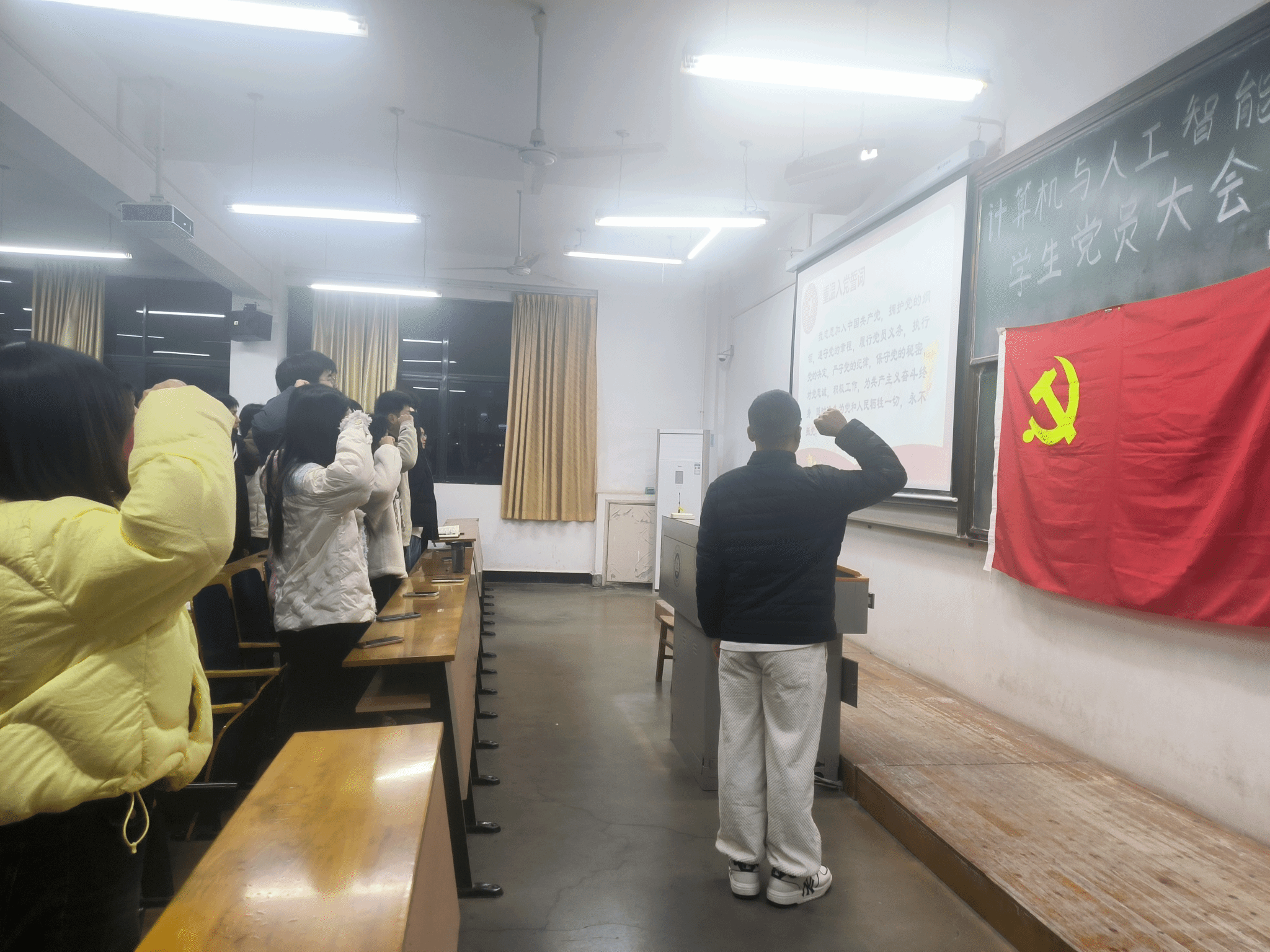 大会在庄严的国歌声中拉开帷幕。与会党员在领誓人张栋的带领下,面对鲜红的党旗,庄严地举起右手,握紧拳头,高声宣读入党誓词。他们的誓言铿锵有力,展现了新时代青年的坚定信念和崇高追求。