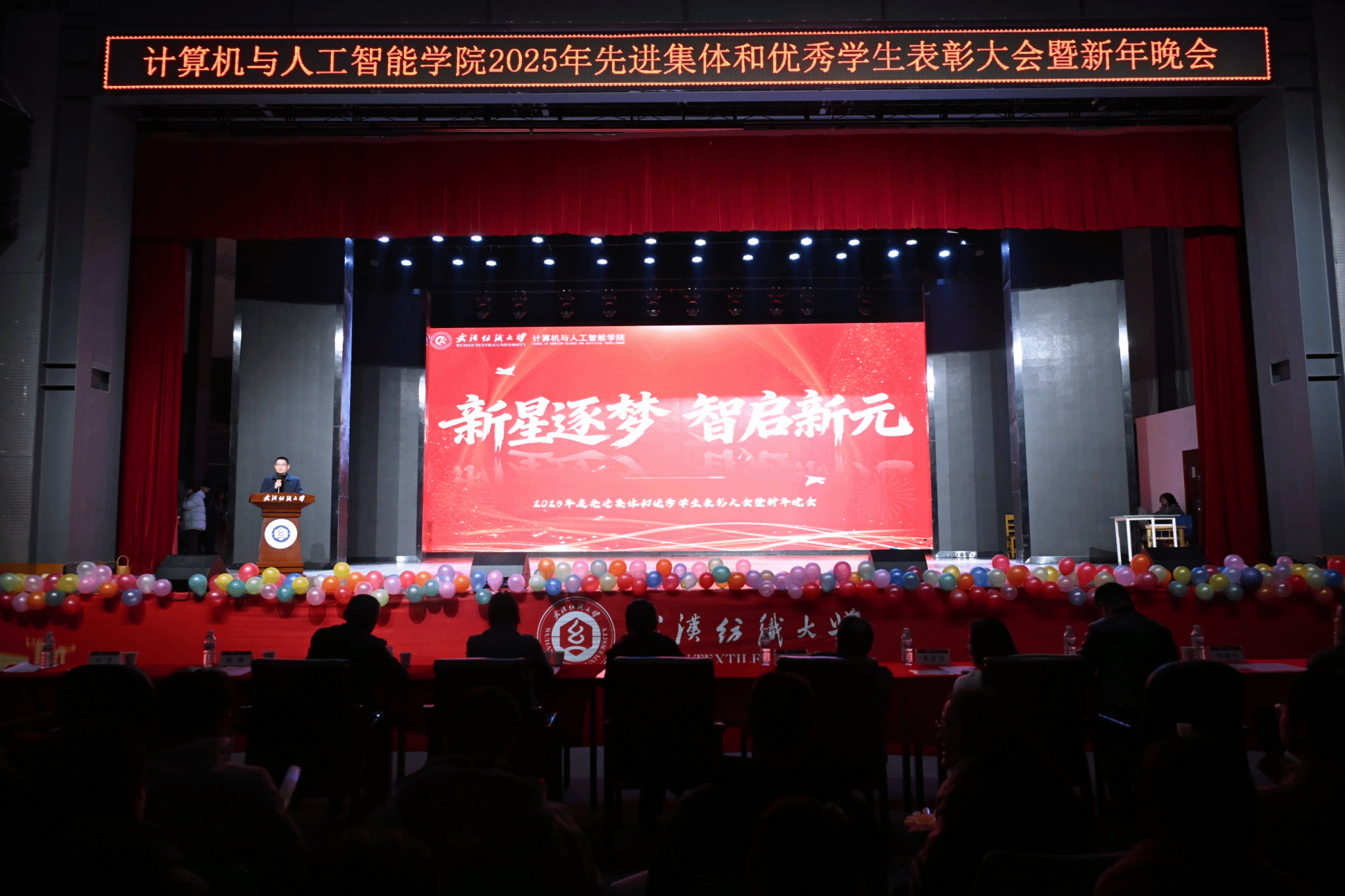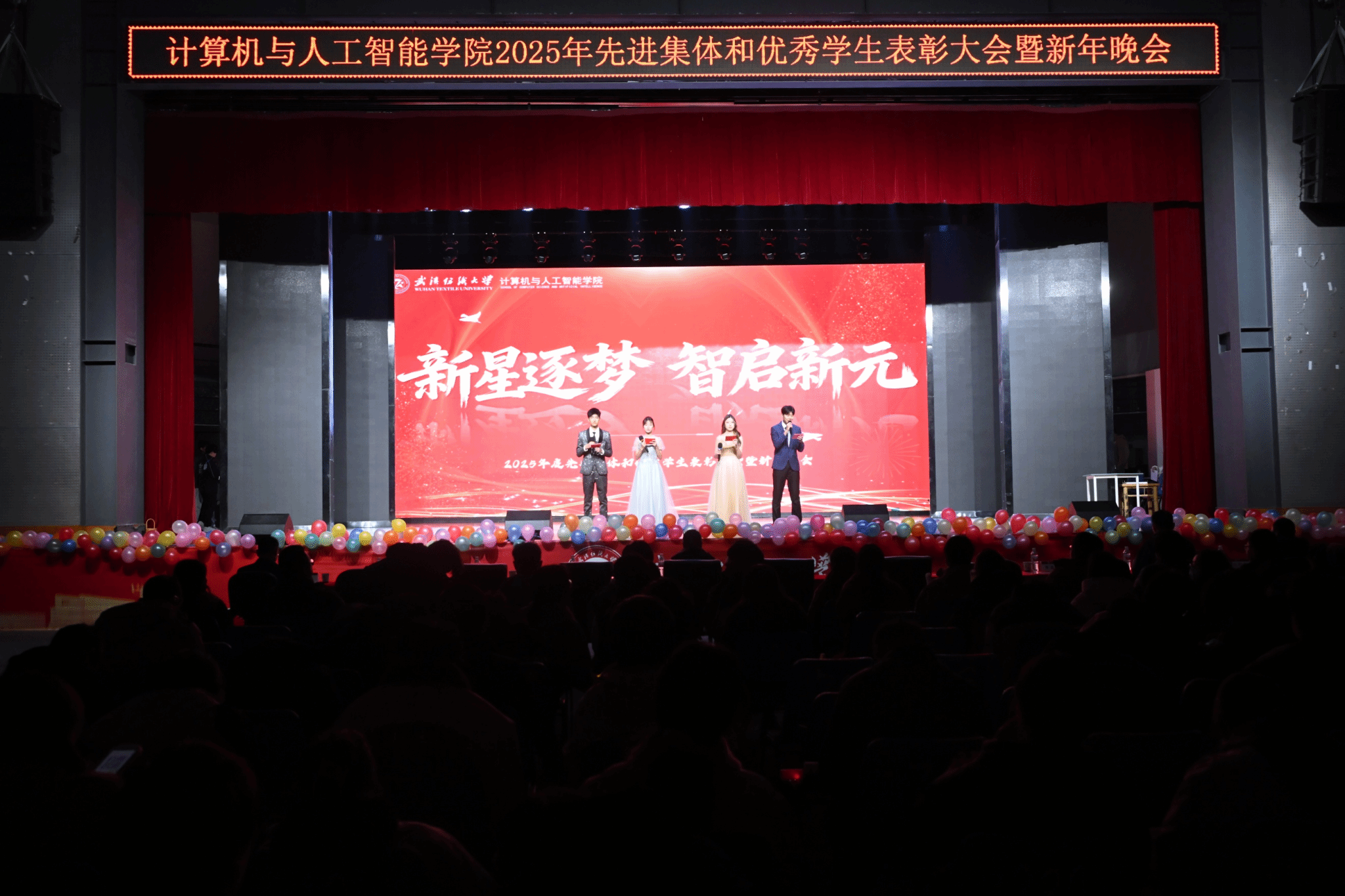表彰大会落下帷幕后,以“新星逐梦·智启新元”为主题的新年晚会,在杨冠宇、彭佳豪、韩萱怡、杨欣怡四位学生主持人的巧妙串联下正式启幕。晚会精心设置“星火·初燃”“征途·共赴”“破晓·智现”“星河·同辉”四个篇章,穿插趣味互动抽奖环节,歌舞、小品、器乐、朗诵等各类节目轮番登台,全方位展现了计智学子的青春风采与多元才华。