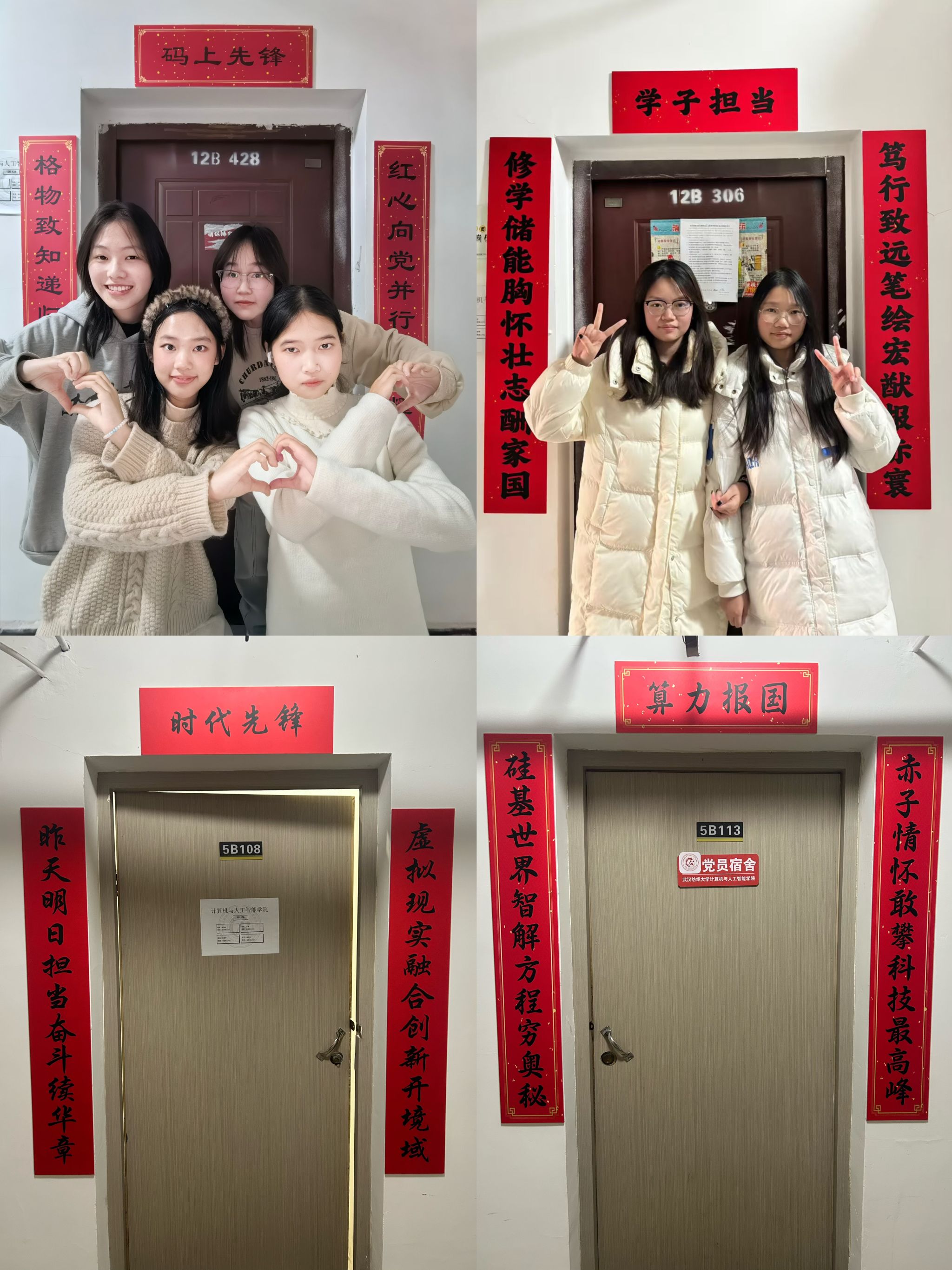 活动自启动以来,得到了学院各寝室同学的积极响应和热情参与。同学们以寝室为单位,围绕“红韵”主题,巧妙构思,将红色元素、励志名言与传统楹联相结合,充分发挥创意,精心装点“小家”。开云kaiyun体育官方网站党委书记晏伟、副书记向涛,在活动中亲自为寝室张贴对联,对同学们表达新春的祝福!