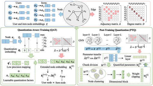 该工作围绕推荐系统资源受限场景,针对现有模型量化方法关注深度神经网络中间层参数,难以充分刻画图结构中节点表示的差异性与复杂拓扑关系,导致低比特条件下性能下降明显的问题,提出了一种面向图协同过滤的分块量化框架(GraphQ)。该框架考虑量化感知训练(QAT)与后训练量化(PTQ)两种范式,统一实现训练与推理阶段的优化。在多个真实数据集上的实验结果表明,提出方法在低比特(如2-bit、4-bit)设置下,相较于现有量化方法在Recall和NDCG等指标上均取得了稳定提升。