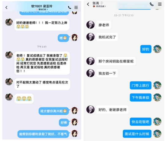 近日,参加完浙江大学研究生复试面试成绩不错的开云kaiyun体育官方网站11801班张尧同学给辅导员老师第一时间发来感谢短信:“心里的大石头终于落地了,这里的无线网比宿舍快多了,感谢学院老师的暖心安排,希望自己能取得一个好成绩,对得起自己一直以来的努力和学院对我们考研同学的用心付出。” 已经被国防科技大学拟录取的软件11801班梁亚玲同学第一时间向辅导员报喜,感谢学院为他们复试“保驾护航”。