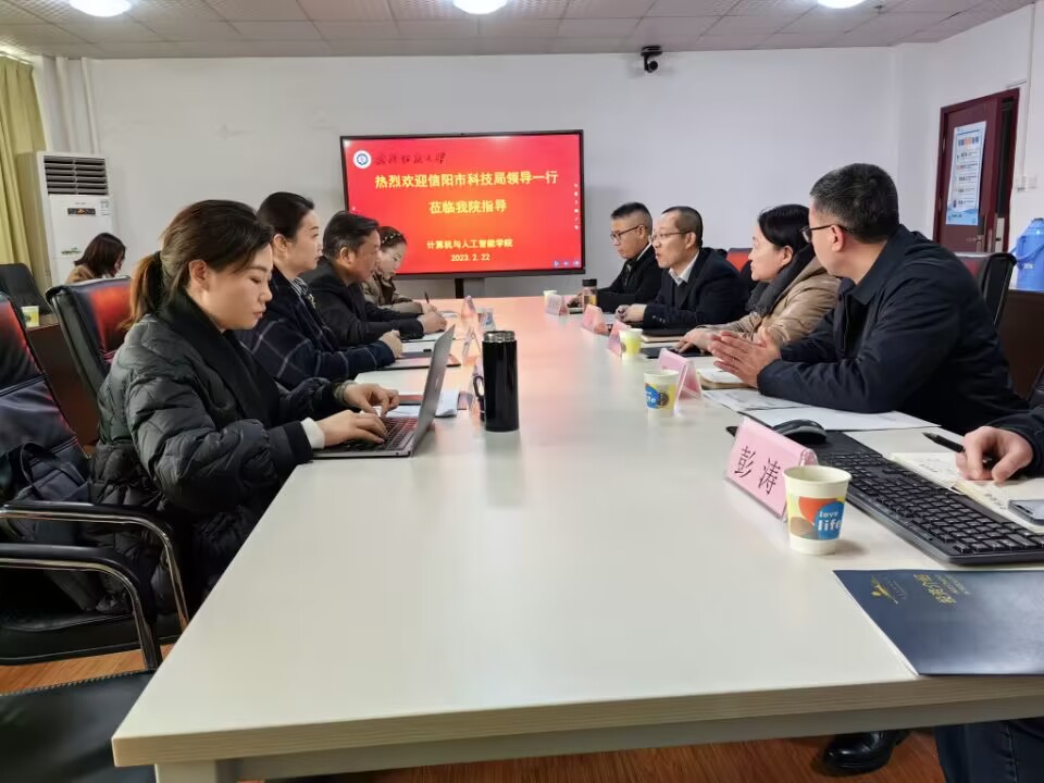 科发院院长吕永钢简要介绍了学校科研工作的总体情况、重点科研平台及项目转化情况;学院院长胡新荣代表学院对信阳市科技局领导的到来表示欢迎,她简要介绍了学院的发展历程和办学成果。