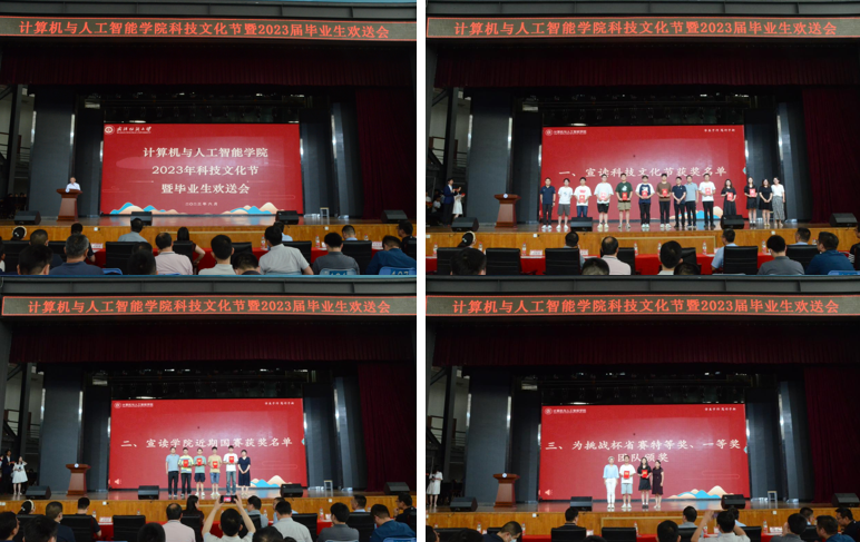 为进一步营造弘扬先进、学习先进、争做先进的氛围,学院表彰了一批优秀学子。副院长魏雄、系主任陈佳、李丽、叶鹏为科技文化节获奖代表颁奖;教务处副处长凡蓉蓉为学院近期国赛获奖代表颁奖;校团委副书记侯畅、院长胡新荣为挑战杯省赛特等奖、一等奖团队颁奖;研究生院副院长唐强、院党委书记晏伟为校优秀毕业生代表颁奖;学工部副部长朱美龙、副院长彭涛为校优秀毕业生奖学金代表颁奖;校团委书记张德科为校就业达人代表颁奖;院长胡新荣、院党委书记晏伟、毕业生辅导员一起为学院“就业工作标兵”颁奖。