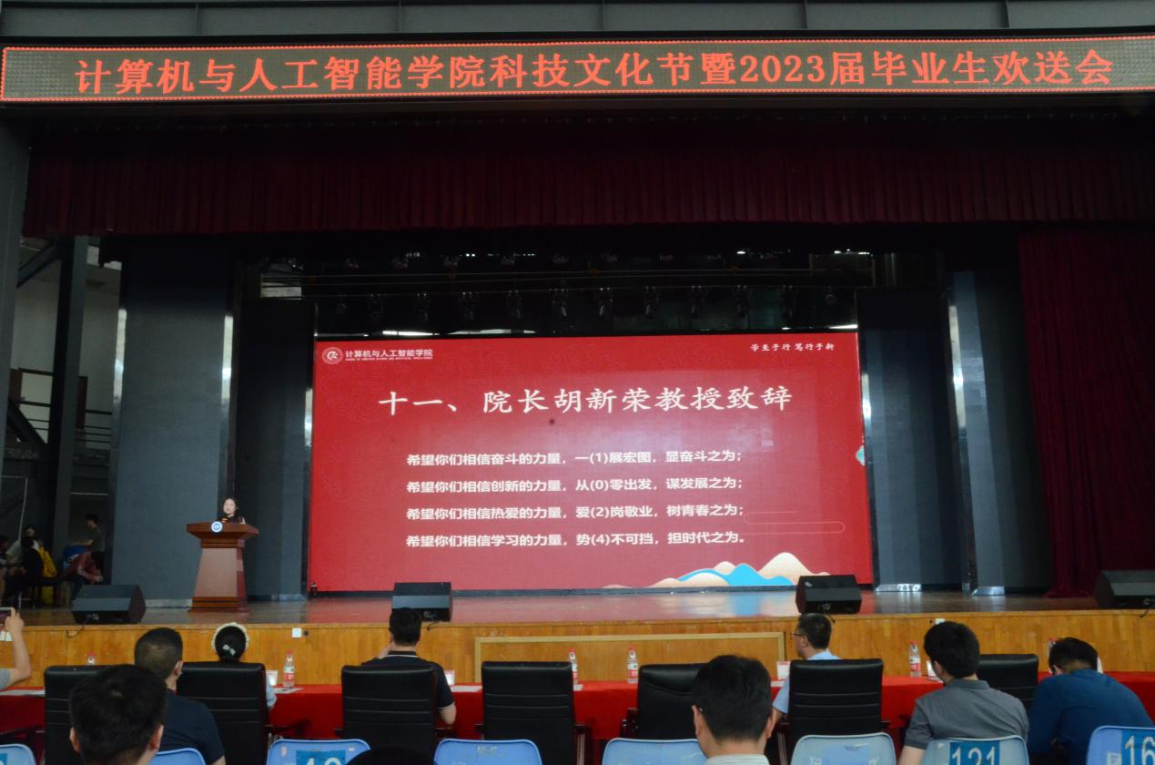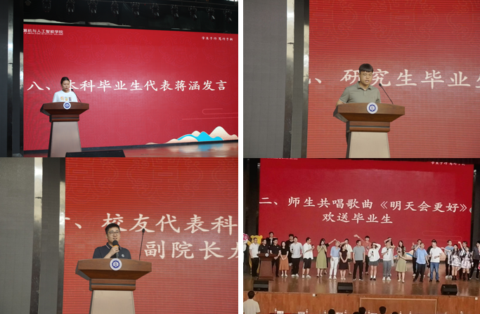 会上,本科毕业生代表蒋涵、研究生毕业生代表吕星航发言,表达了对学校、学院的感激之情;2011届校友、科大讯飞AI工程院常务副院长龙明康发言,和大家回顾了工作感悟、介绍了最新技术前沿,和学弟学妹们分享了关于机会、成长、信念的故事。广大学子为大家带来了《极乐净土》等舞蹈节目,《蒲公英的约定》等歌曲,师生共唱《明天会更好》,学长学姐和学弟学妹们互送祝福,现场气氛热烈、热情洋溢。