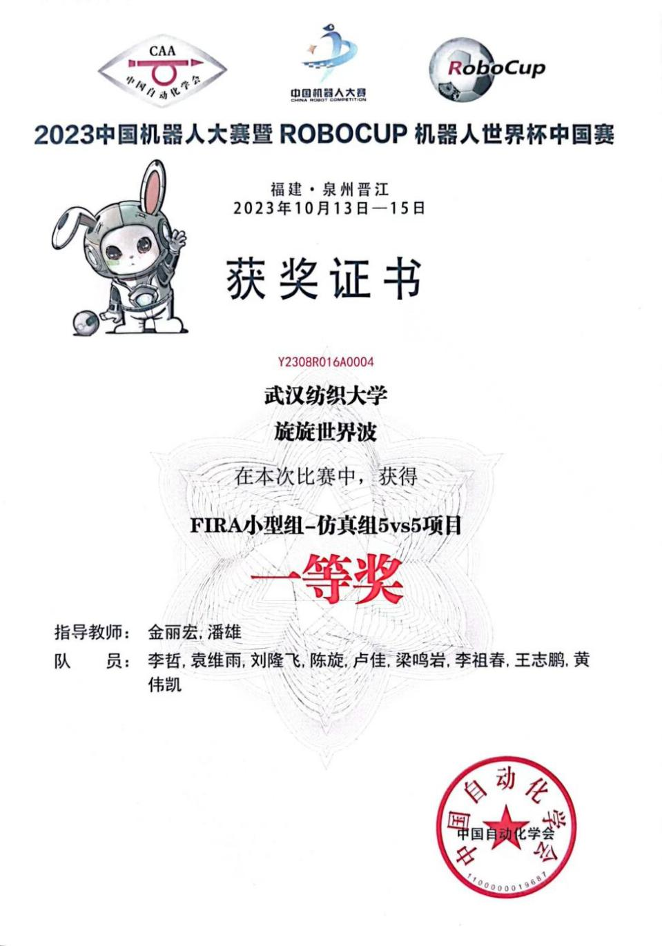 10月12日至15日,由中国自动化协会承办的2023年“中国机器人大赛暨Robocup机器人世界杯中国赛”在福建晋江国际会展中心落下帷幕。本届大赛为我校首次参赛,学校派出数理科学学院的金丽宏老师和开云kaiyun体育官方网站的潘雄老师指导机器人足球小队参赛。其中,由本科生李哲、袁维雨、刘隆飞、卢佳等同学组成的队伍——旋旋世界波,在FIRA5vs5仿真组获得全国一等奖,实现了我校在该项赛事中的新突破。