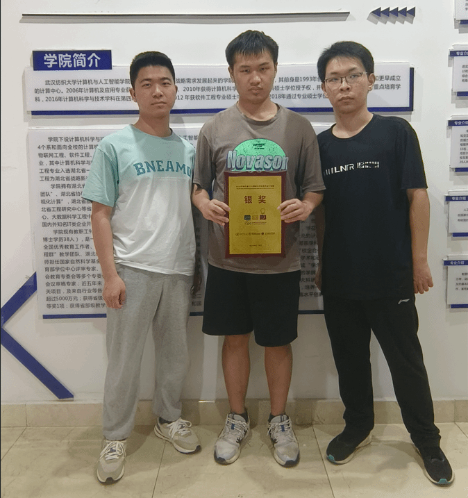 本次比赛在华中科技大学网络空间安全学院国家网络安全人才与创新基地校区举行,共有来自湖北省的36所高校,总计183支队伍参赛。比赛获奖难度较大,获奖队伍数量仅占有效队伍的60%。其中蒋沈浩、苏宇曦、胡劲睿队伍表现尤为突出,获得一枚银牌。根据参赛队员回忆:开局三人分开看题,顺利通过两题E、A,还有一道比较大的分类讨论L题被卡住,随后一人思考L题,两人去开其他题,其中J题算贡献由于快速幂手写错误导致的bug卡了很久,B题简单的计算几何由于精度问题被卡住,发现问题后接连通过,而开局的L题也在不断地尝试下被解出。随后看到了H题,但是一开始思路便错了,本该DP的题用贪心的思路去做,浪费了很多时间,还好封榜过后及时发现问题并调整了思路,有惊无险地解出这题,最终排名也跃升至银牌区。