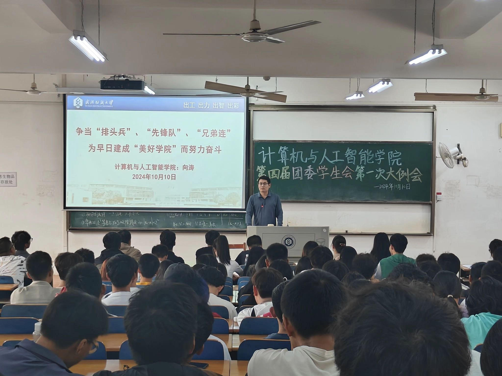 向涛书记发言。他首先对学生会分工安排进行了介绍,并强调了学生工作要贯穿始终。随后,向书记就为什么担任学生干部、计算机学院荣誉与学生干部的付出、党员与学生会干部的关系以及线下活动等方面进行了详细讲解。为了激励学生干部更好地履行职责、发挥作用,他提出了“排头兵、先锋队、兄弟连”三个概念,鼓励学生干部要勇于担当、敢于创新、团结协作,并在最后向大家送上了美好的祝福语。