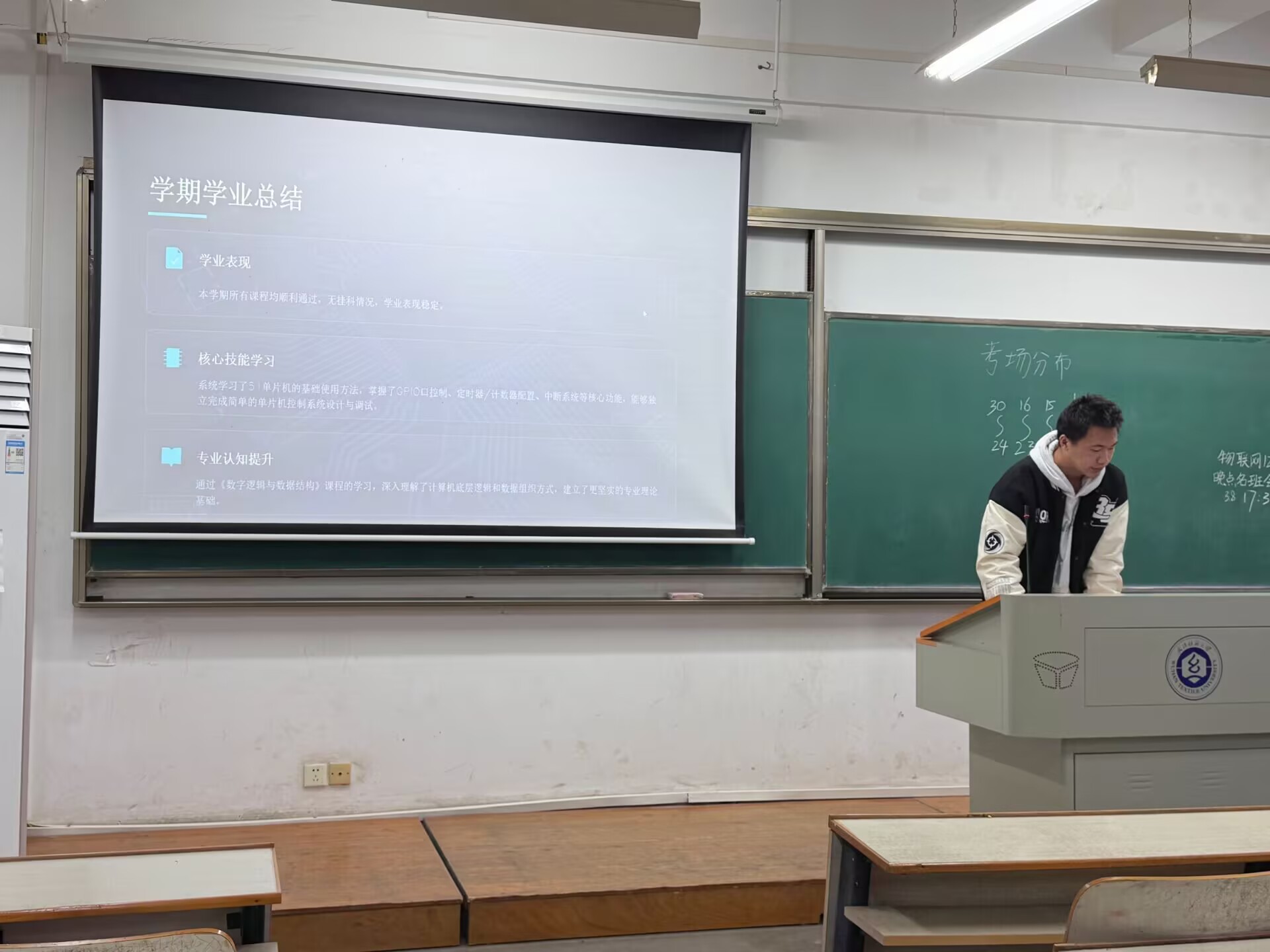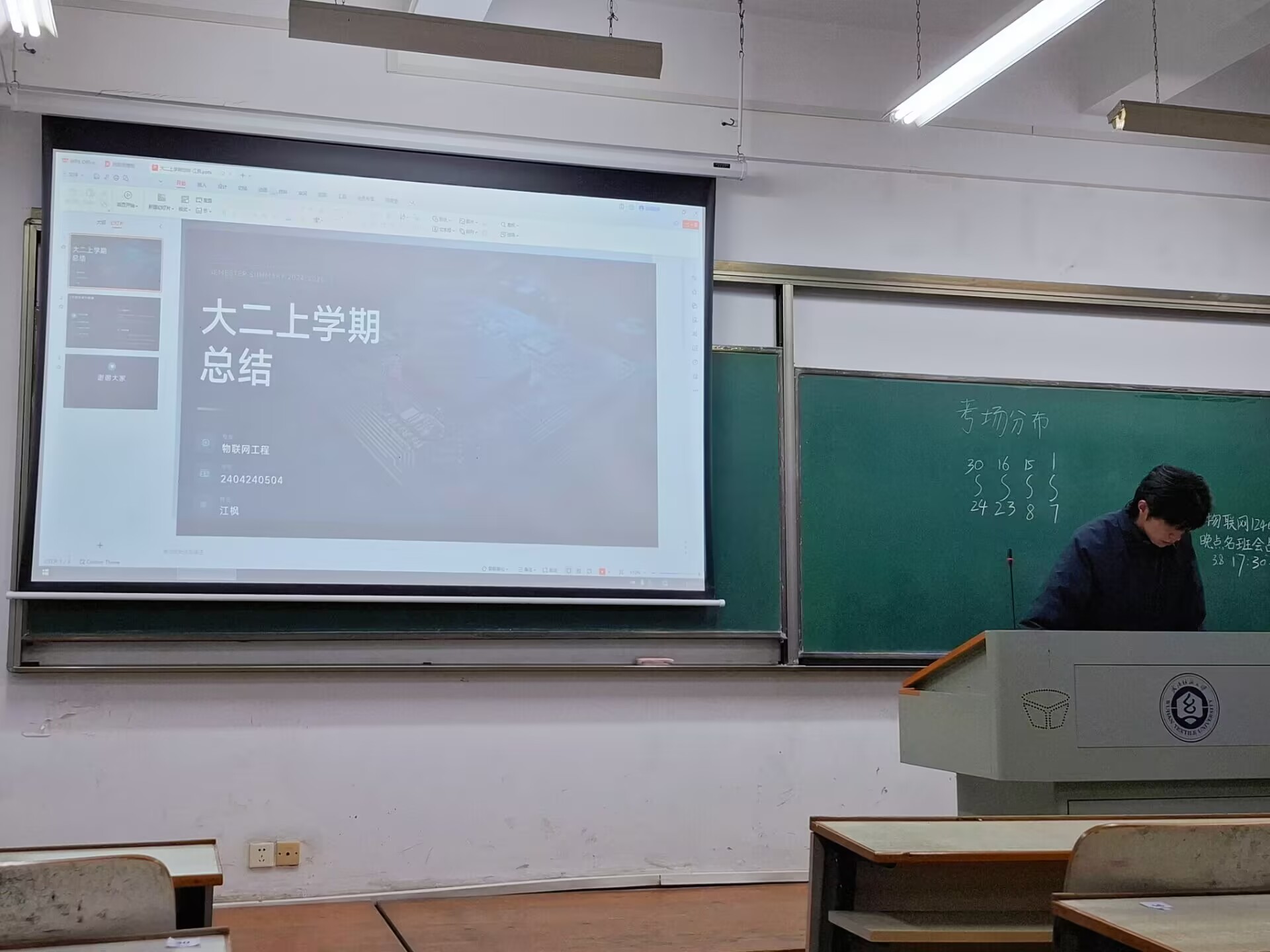 为全面复盘上学期学习成效,正视自身学习短板,明确新学期学习目标与改进方向,近日,物联网12401班召开学期总结主题班会。本次班会以个人复盘、自我反思、规划未来为核心,全班同学逐一展示个人总结PPT,坦诚分享上学期学习不足、挂科问题及新学期提升计划,班会由班长主持,全体同学共同参与,丁磊老师和辅导员李港老师参与指导,在务实自省的氛围中完成了一次深刻的学习总结与规划交流。