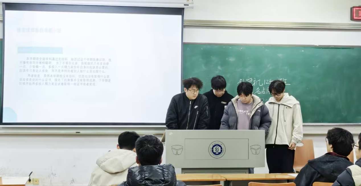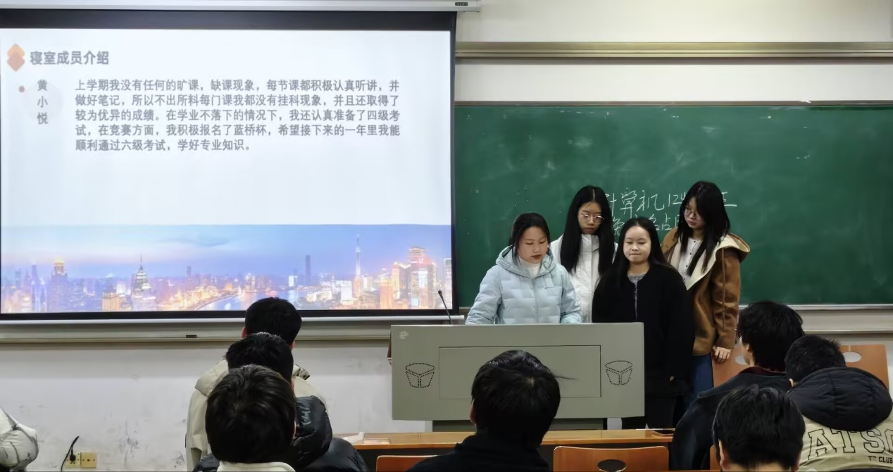 大二上半学年落下帷幕,计算机12402班迎来新发展阶段。为进一步增强集体凝聚力,推动学业提升,更早明确备考方向方向,规划毕业蓝图,近日,我班在崇志楼举行2025-2026学年春季学期小结班会。本次班会由班长卻昌辉主持,辅导员李港全程指导,采用"宿舍汇报制",全班10个宿舍依次登台分享,分享成长的点滴与未来的愿景。