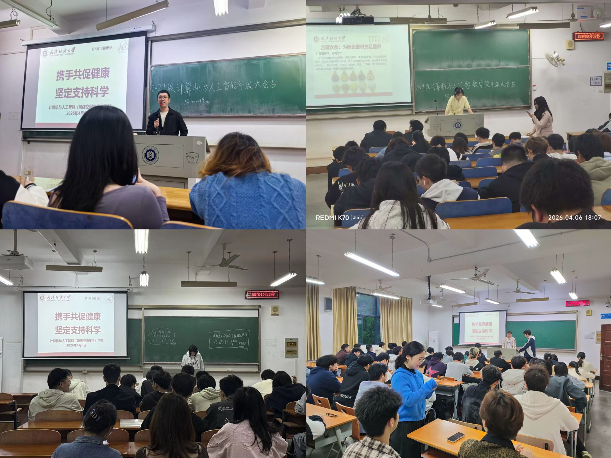健康担使命,科学谱新篇。为深入贯彻习近平总书记关于健康中国的论述,积极响应国家“体重管理年”三年行动号召,迎接第78个世界卫生日,计算机与人工智能(网络空间安全)学院于4月6日晚召开“携手共促健康,坚定支持科学”主题班会。学院全体辅导员及各年级学生共同参与,本次班会以科学健康观为引领,为莘莘学子成长保驾护航。