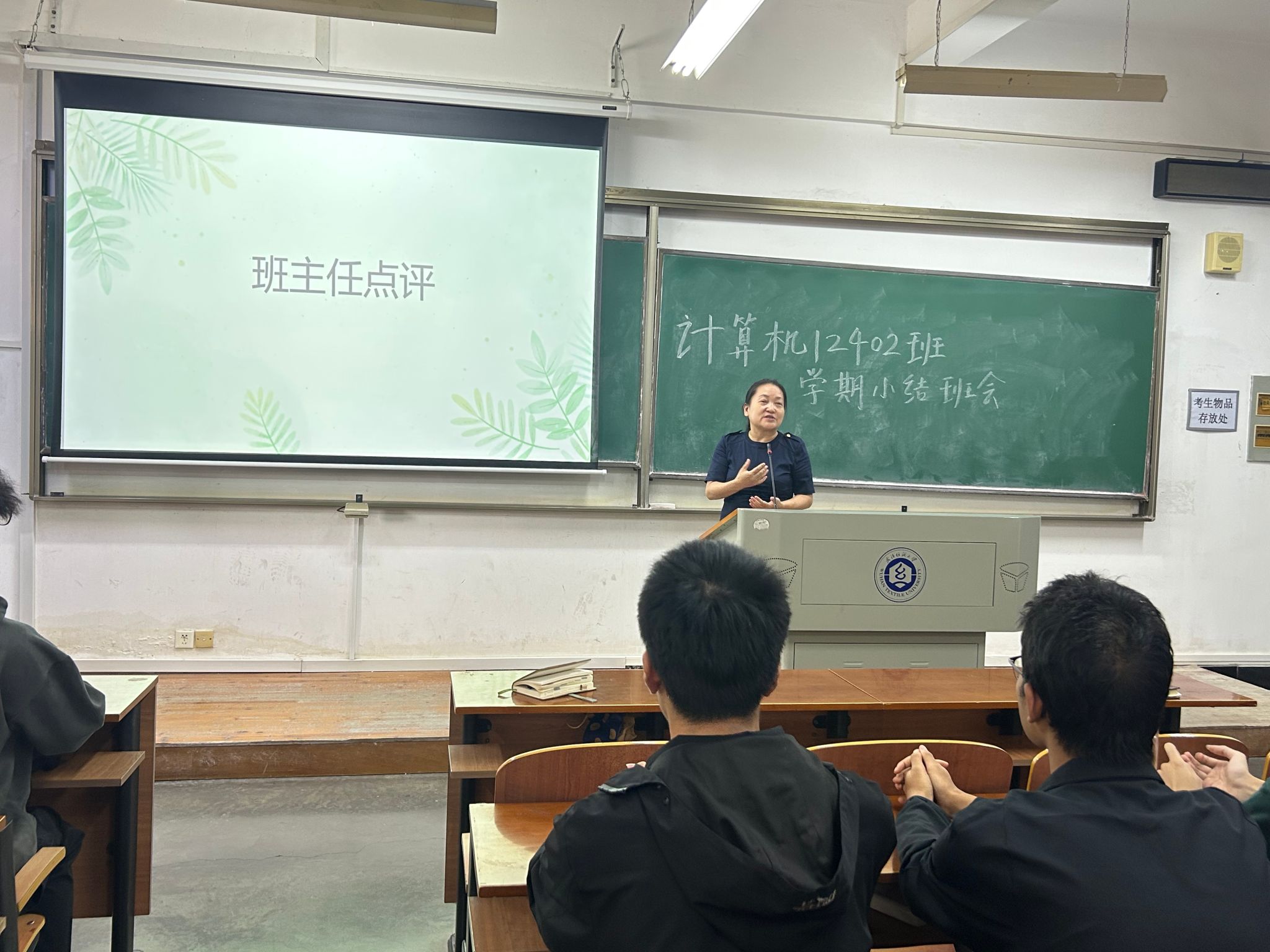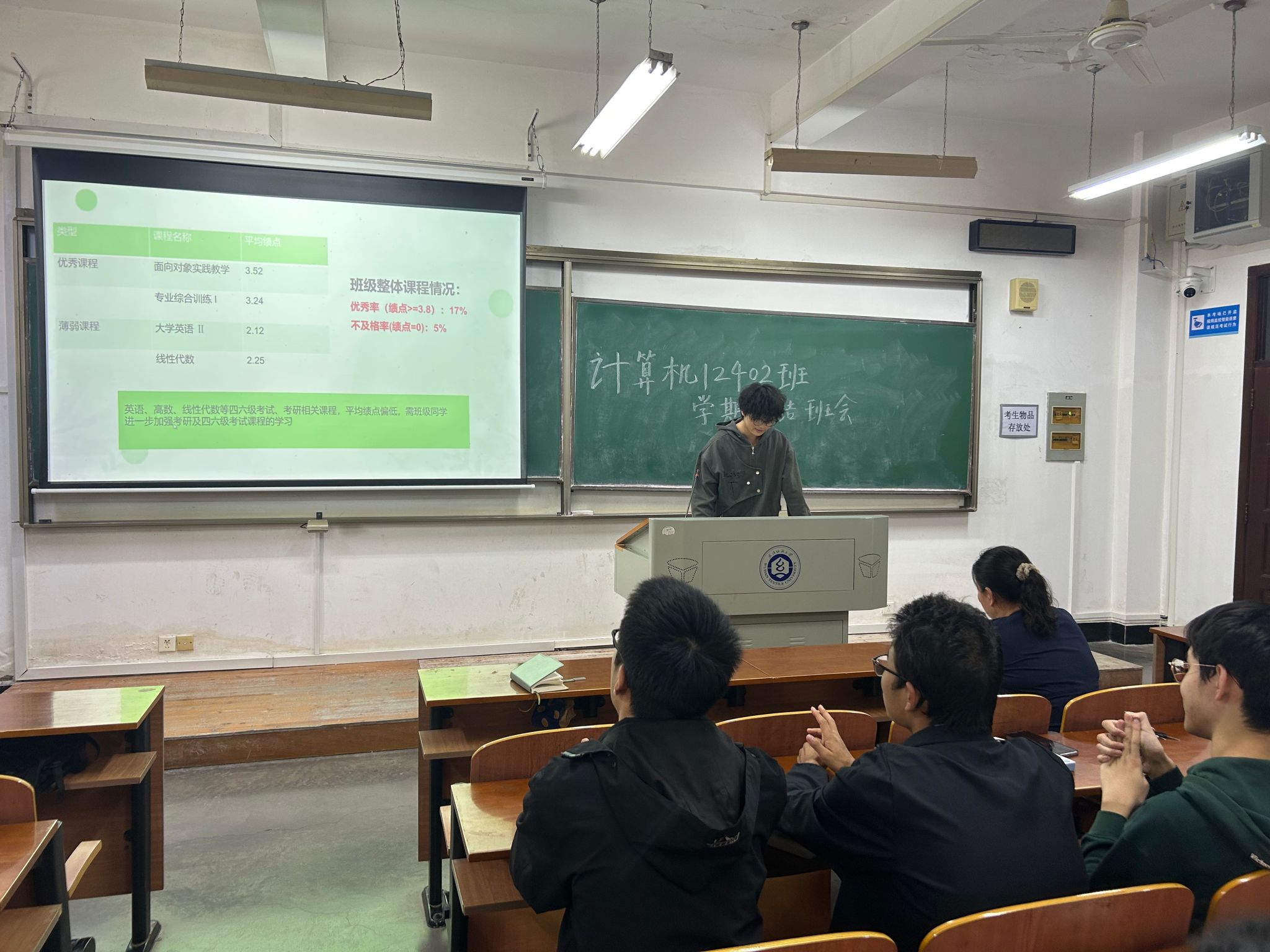 本次班会以总结学期情况、明确未来方向为主题,班级学生以寝室为单位,分别围绕基础学业情况、学科竞赛获奖情况、学生活动参与情况及寝室卫生情况、未来发展规划展开详细汇报。