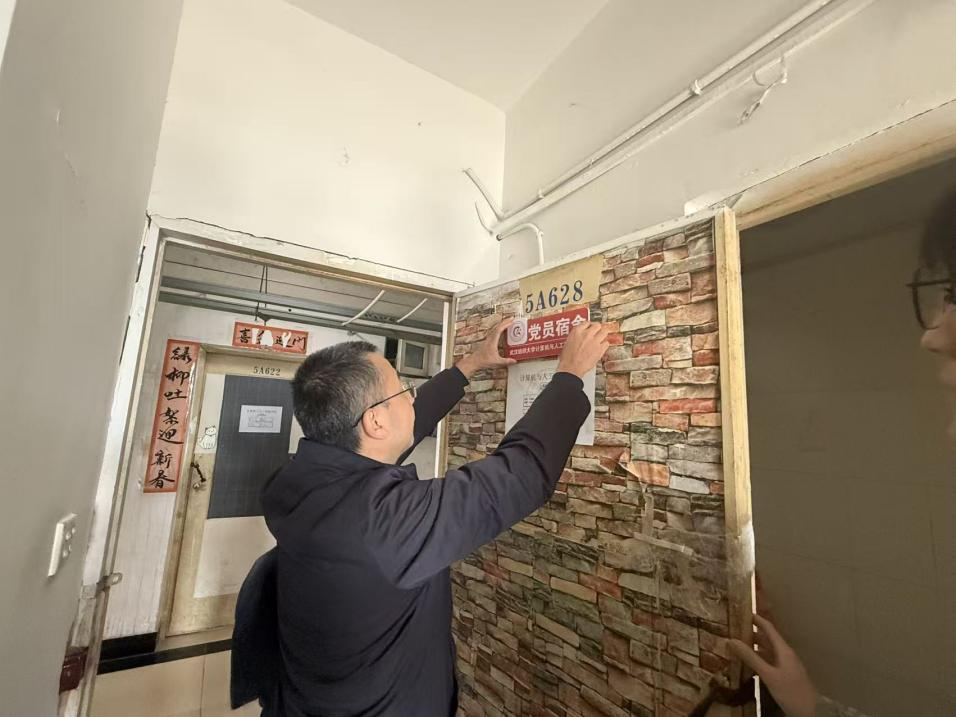 随后,学院领导、辅导员和党支部书记们分组深入学生公寓,亲自为党员宿舍挂牌。在宿舍与同学们亲切交谈,详细询问了他们的专业学习、项目进展和日常生活情况,并亲手将“党员宿舍”门牌张贴在宿舍门的醒目位置。